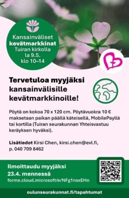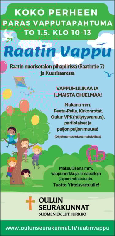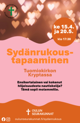 Ilm. 9.4.–12.5. www.oulunseurakunnat.fi. Lisätietoja Virpi Huttunen, p. 040 500 3263, Viivi Jokela, p. 050 513 3225.
