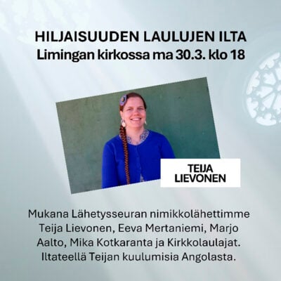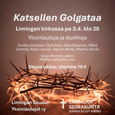 Hiljaisen viikon musiikki-ilta ”Ristin alla laulamalla” ke 1.4. klo 18 Tyrnävän kirkko. Yhteisvirsiä, kuoromusiikkia ja iltahartaus. Mukana Matias Muhola, Salla Kujala, lauluyhtye Leivo. Tilaisuutta ei striimata. Vapaa pääsy, lämpimästi tervetuloa!