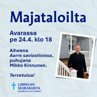 Raamattu- ja rukousilta Leena ja Sulo Väliheikillä ke 22.4. klo 17.30 Kylmäläntie 127. Aloitamme klo 17.30 kahvittelulla, jonka jälkeen tutkimme Raamattua sekä laulamme ja rukoilemme yhdessä. Tervetuloa mukaan yhteiseen iltaan.