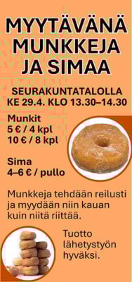 €uron aamiainen to 23.4. klo 7.30–9 srk-salissa. Tervetuloa yhdessä syömään ja kohtaamaan toisia kyläläisiä yhden euron hintaisella aamiaisella.