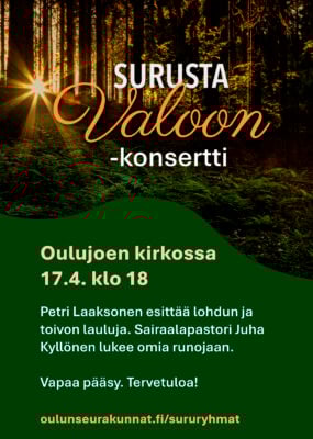 Kuva meissä – työpaja taiteen äärellä kolmena peräkkäisenä tiistaina 7.–21.4. Wirkkulassa. Työskentelemme pääsiäisen teemojen äärellä lempeän liikkeen, kuvallisen tai kirjallisen ilmaisun avulla, hiljaisuutta vaalien. Ryhmään osallistuminen ei edellytä taiteellisesta osaamista. Ilm. to 2.4. mennessä Riitalle, riitta.yliluoma@evl.fi / 040 662 6359. Ryhmää ohjaavat kuvataidekasvattaja, taideterapeutti. TaK, FT Laura Katriina Aura ja perhetoiminnanohjaaja Riitta Yliluoma.