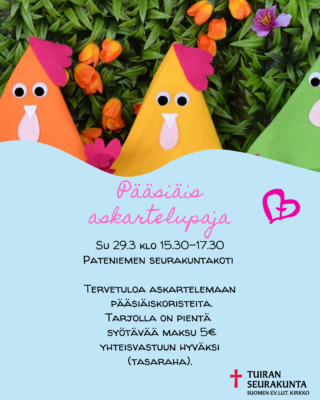 Pääsiäisaskartelupaja su 29.3.klo 15.30–17.30 Pateniemen srk-kodissa. Tervetuloa askartelemaan pääsiäiskoristeita. Tarjolla pientä syötävää, maksu 5 € Yhteisvastuun hyväksi (tasaraha).